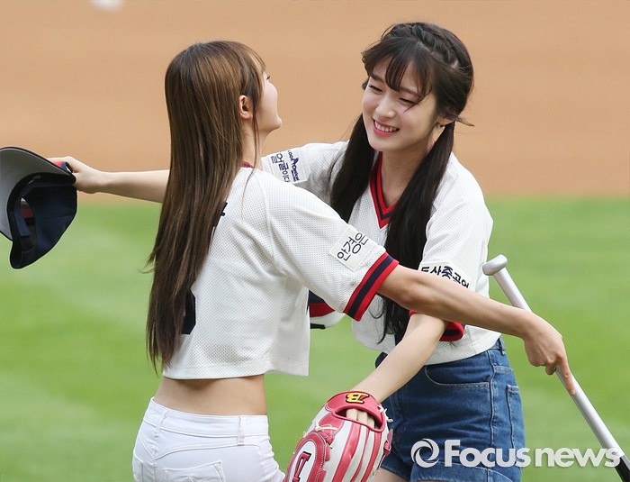(서울=포커스뉴스) 10일 서울 잠실구장에서 열린 2016 프로야구 넥센-두산 경기에 앞서 걸그룹 '오마이걸'의 아린(오른쪽)과 유아가 시구, 시타를 마치고 포옹하고 있다.