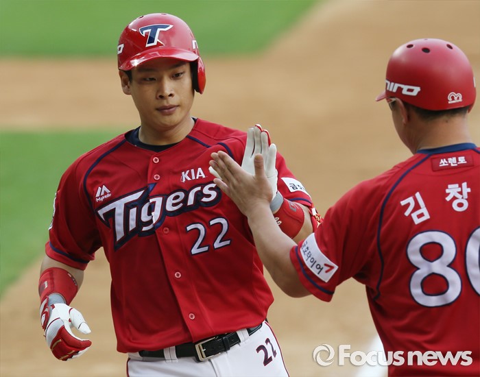 (서울=포커스뉴스) 10일 서울 잠실구장에서 열린 2016 프로야구 KIA-두산 경기 3회초 1사후 KIA 백용환이 좌월 솔로 홈런을 치고 김창희 코치의 환영을 받으며 홈인하고 있다.