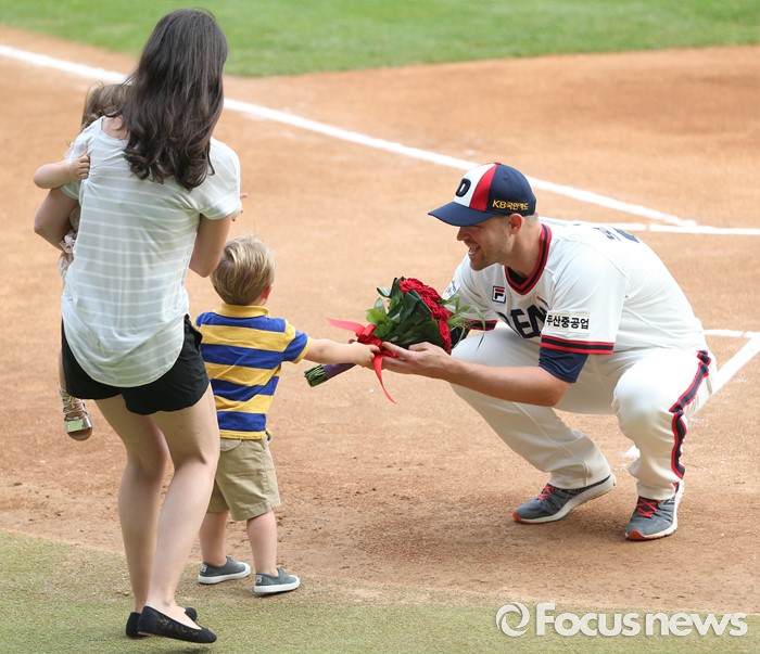 (서울=포커스뉴스) 10일 서울 잠실구장에서 열린 2016 프로야구 KIA-두산 경기에 앞서 가진 두산 투수 보우덴의 노히트노런 기록 달성 시상식에서 보우덴의 아들이 꽃다발을 전달하고 있다.