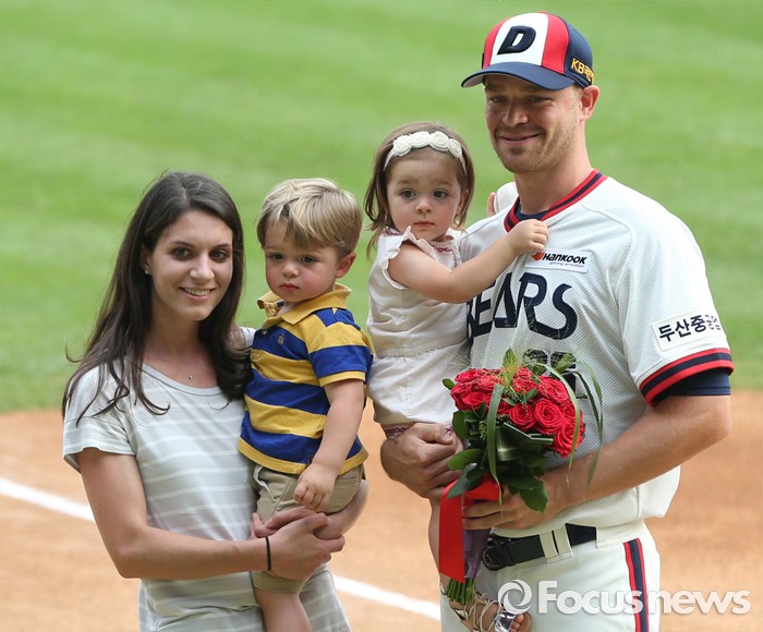 (서울=포커스뉴스) 10일 서울 잠실구장에서 열린 2016 프로야구 KIA-두산 경기에 앞서 가진 두산 투수 보우덴의 노히트노런 기록 달성 시상식에서 보우덴이 가족과 함께 기념사진을 찍고 있다.