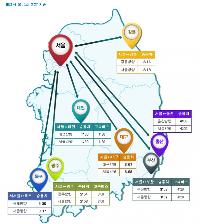 서울에서 주요 도시까지 소요되는 시간은 오후 9시 기준 강릉 2시간19분, 대구 3시간8분, 울산 4시간5분, 부산 3시간57분, 광주 2시간58분, 목포 3시간37분, 대전 1시간30분 등이다.