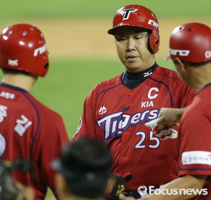 (서울=포커스뉴스) 10일 서울 잠실구장에서 열린 2016 프로야구 KIA-두산 경기 7회초 1사 2루에서 KIA 이범호가 좌월 2점 홈런을 치고 선행주자의 환영을 받으며 홈인하고 있다.