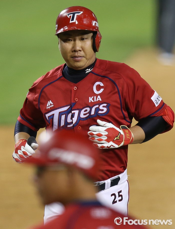 (서울=포커스뉴스) 10일 서울 잠실구장에서 열린 2016 프로야구 KIA-두산 경기 7회초 1사 2루에서 KIA 이범호가 좌월 2점 홈런을 치고 홈인하고 있다.