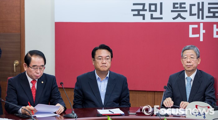 (서울=포커스뉴스) 11일 오전 서울 여의도 새누리당사에서 열린 혁신비상대책위원회의에 지도부들이 참석하고 있다. 왼쪽부터 박명재 새누리당 사무총장, 정진석 원내대표, 김희옥 혁신비상대책위원장.