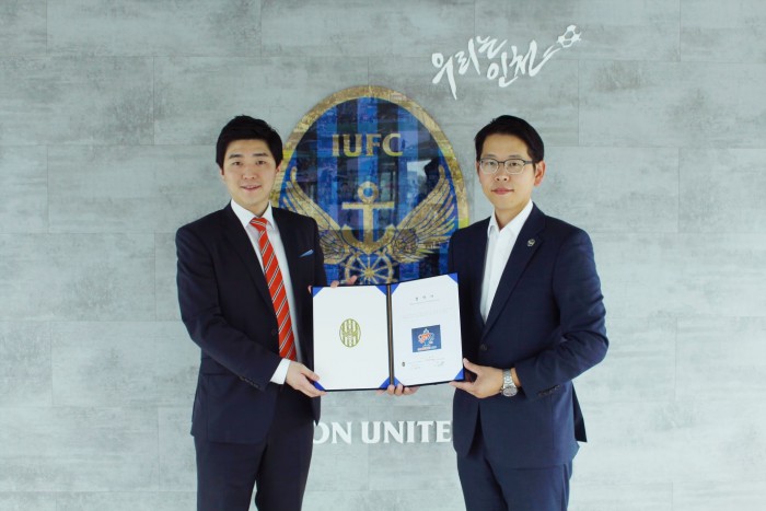 서지원 캠펑 대표는 "가장 친근한 대학 생활 공간인 학과를 중심으로 선후배들이 팀을 꾸려 전국 단위 대회 참여는 잊지 못할 추억이 될 것"이라고 전했다. (주)캠펑은 대학생 필수 정보앱 '아이캠펑'을 운영하는 업체다.(주)캠펑의 서지원 대표(왼쪽)와 인천 유나이티드 이민협 팀장이 '2016 캠펑스컵 전국 대학생축구대회' 개최 협약 뒤 포즈를 취하고 있다. <사진제공=(주)캠펑>