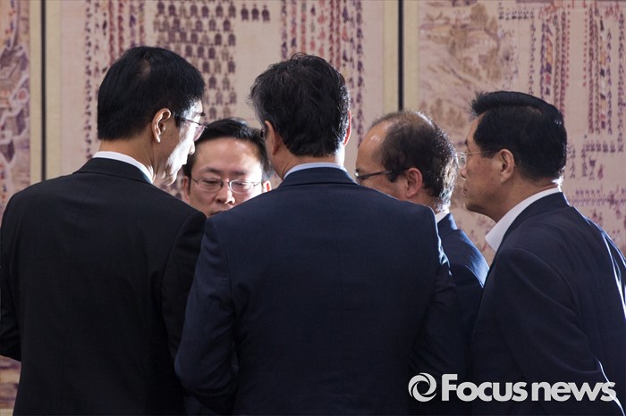 (서울=포커스뉴스) 이준식(왼쪽) 교육부 장관이 11일 오전 서울 여의도 국회에서 열린 교육문화체육관광위원회 전체회의에 참석해 '개돼지 발언 논란'을 일으킨 나향욱 교육부 정책기획관 출석 요구 공방으로 회의가 정회되자 교육부 관계자들과 의견을 교환 하고 있다.