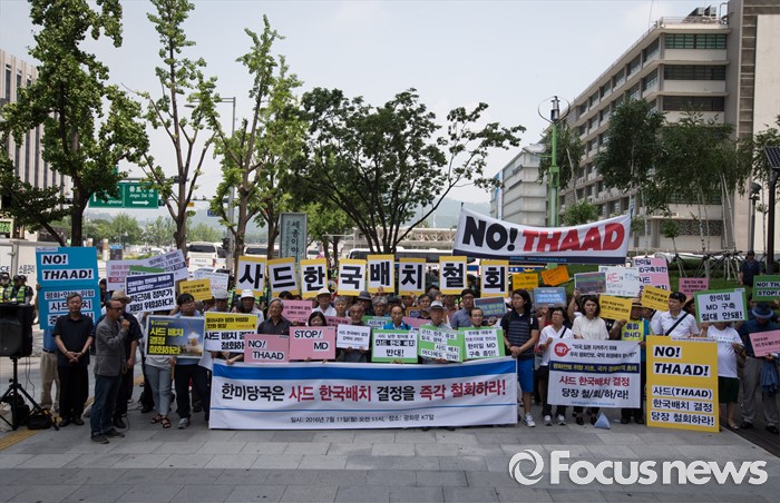 (서울=포커스뉴스) '평화와 통일을 여는 사람들' 관계자 및 사드 한국 배치를 반대하는 시민들이 11일 오전 서울 종로구 주한 미국 대사관 앞에서 사드 한국 배치 결정 철회 촉구 기자회견을 하고 있다.