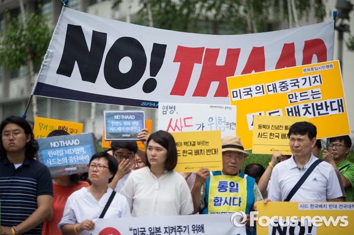 (서울=포커스뉴스) '평화와 통일을 여는 사람들' 관계자 및 사드 한국 배치를 반대하는 시민들이 11일 오전 서울 종로구 주한 미국 대사관 앞에서 사드 한국 배치 결정 철회 촉구 기자회견을 하고 있다.