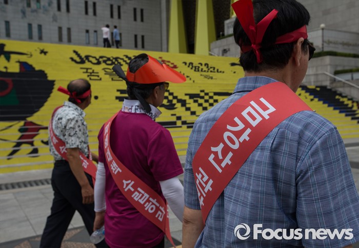 (서울=포커스뉴스) 금강산관광 중단 8년째를 맞아 금강산관광 중단 피해대응 고성군 추진위원회 회원들이 11일 오후 서울 종로구 서울정부청사앞에서 지원대책 마련 촉구 집회를 갖기 위해 이동하고 있다.