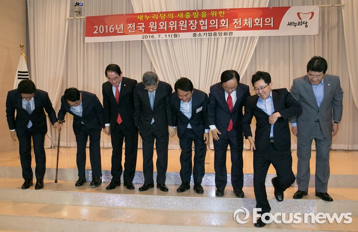 (서울=포커스뉴스) 11일 오후 서울 여의도 중소기업중앙회관에서 열린 새누리당 전국원외위원장협의회 전체회의에 참석한 지도부와 전당대회 출마자 등이 취재진을 향해 포즈를 취한 뒤 인사하고 있다. 왼쪽부터 정병국 의원, 심재철 국회 부의장, 박명재 사무총장, 김희옥 혁신비대위원장, 이성헌 전국원외위원장협의회장, 이주영, 김용태, 강석호 의원.