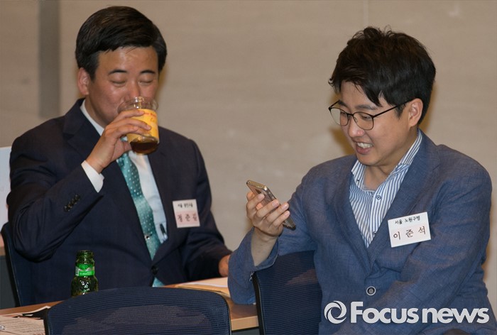 (서울=포커스뉴스) 11일 오후 서울 여의도 중소기업중앙회관에서 열린 새누리당 전국원외위원장협의회 전체회의에 참석한 이준석(오른쪽) 노원병 위원장과 정준길 광진을 위원장이 자리하고 있다.