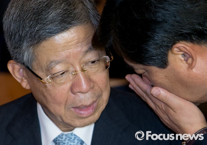 (서울=포커스뉴스) 11일 오후 서울 여의도 중소기업중앙회관에서 열린 새누리당 전국원외위원장협의회 전체회의에 참석한 김희옥(왼쪽) 혁신비대위원장과 김선동 비서실장이 대화하고 있다.