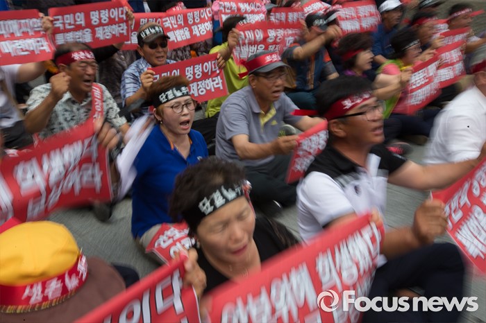 (서울=포커스뉴스) 금강산관광 중단 8년째를 맞아 금강산관광 중단 피해대응 고성군 추진위원회 회원들이 11일 오후 서울 종로구 서울정부청사앞에서 지원대책 마련을 촉구하며 구호를 외치고 있다.