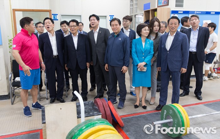 (서울=포커스뉴스) 박지원(왼쪽 다섯번째) 국민의당 비상대책위원장을 비롯한 주요 당직자들이 11일 오후 서울 노원구 태릉선수촌에 방문해 윤석천(왼쪽) 역도 감독과 대화하고 있다.