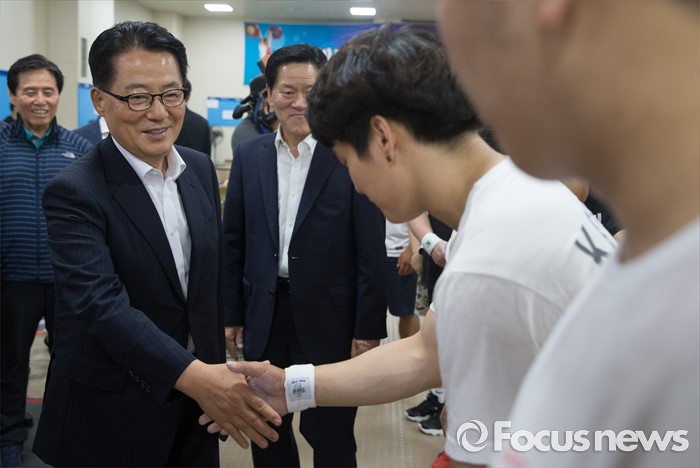 (서울=포커스뉴스) 박지원(왼쪽) 국민의당 비상대책위원장을 비롯한 주요 당직자들이 11일 오후 서울 노원구 태릉선수촌에 방문해 역도 국가대표 선수들을 격려하고 있다.
