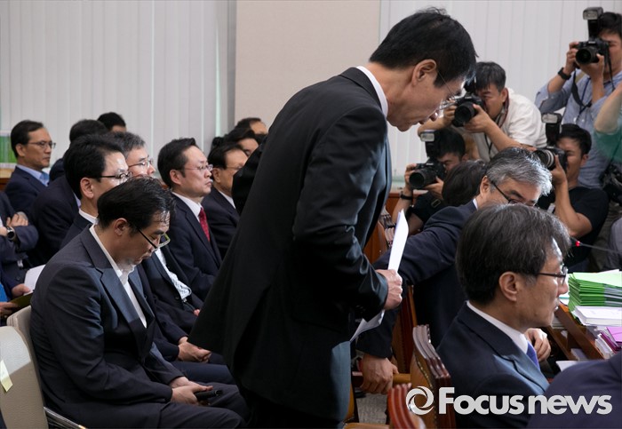 (서울=포커스뉴스) 11일 오후 서울 여의도 국회에서 열린 교육문화체육관광위원회 전체회의에 참석한 이준식 사회부총리 겸 교육부 장관이 제안설명을 마친 뒤 자리로 향하고 있다. 왼쪽은 "민중은 개·돼지"라고 발언해 물의를 빚은 나향욱 교육부 정책기획관.