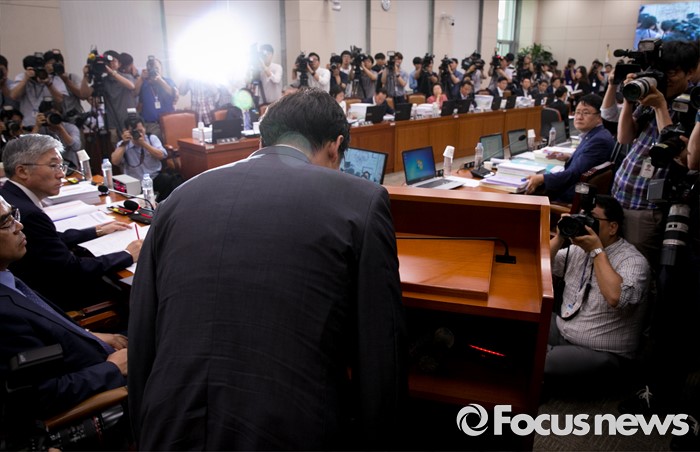 (서울=포커스뉴스) 11일 오후 서울 여의도 국회에서 열린 교육문화체육관광위원회 전체회의에 "민중은 개·돼지"라고 발언해 물의를 빚은 나향욱 교육부 정책기획관이 참석해 의원들의 질의에 답하기 앞서 인사하고 있다.