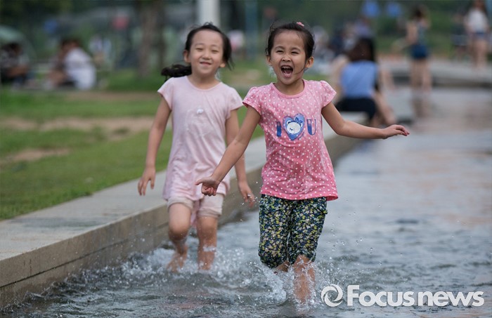 (서울=포커스뉴스) 올해 들어 첫 열대야가 발생한 11일 오후 서울 여의도 한강공원을 찾은 시민들이 더위를 피해 물놀이를 하고 있다.
