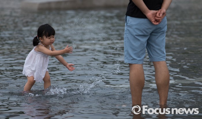 (서울=포커스뉴스) 올해 들어 첫 열대야가 발생한 11일 오후 서울 여의도 한강공원을 찾은 한 아이가 아빠를 향해 물장구를 치고 있다.