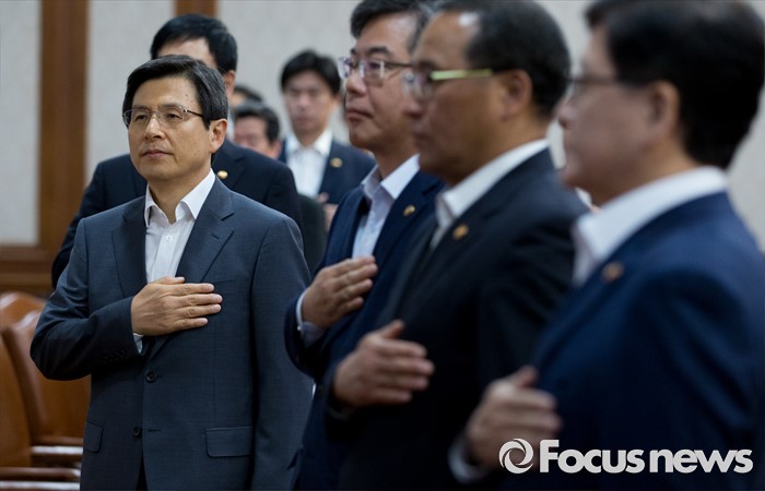 (서울=포커스뉴스) 황교안 국무총리(왼쪽)를 비롯한 국무위원들이 12일 오전 정부서울청사에서 열린 국무회의에 참석해 국민의례를 하고 있다.