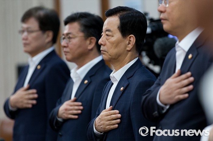 (서울=포커스뉴스) 한민구 국방부 장관이 12일 오전 정부서울청사에서 열린 국무회의에서 국민의례를 하고 있다.