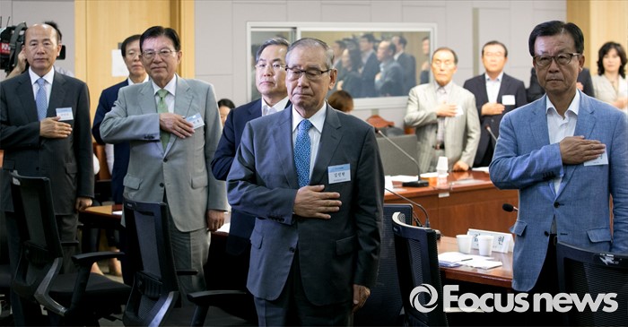 (서울=포커스뉴스) 12일 오전 서울 여의도 국회 의원회관에서 국가전략포럼 주최로 열린 국민이 바라는 개헌, 어떻게 할 것인가? 세미나에 참석한 원혜영(앞줄 오른쪽부터) 더불어민주당 의원, 김진현 세계평화포럼 이사장, 우윤근 국회 사무총장, 김덕룡 민주화추진협의회 이사장 등이 국기에 대한 경례를 하고 있다.