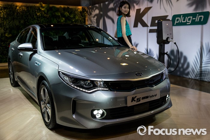 (서울=포커스뉴스) 12일 오전 서울 강남구 인터와이드 스튜디오에서 열린 '2017 K5, K5 PHEV' 출시 사진 및 영상 발표회에 K5 'PHEV' 차량이 전시되어 있다.