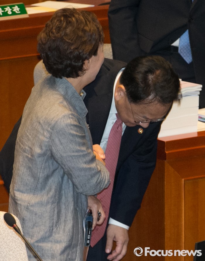 (서울=포커스뉴스) 12일 오전 서울 여의도 국회에서 2015회계연도 결산을 위해 열린 예산결산특별위원회 전체회의에 참석한 김현미(왼쪽) 위원장과 유일호 경제부총리 겸 기획재정부 장관이 인사하고 있다.