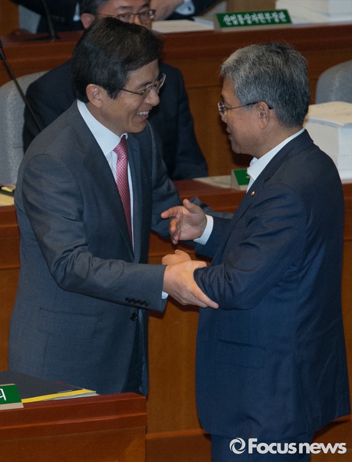 (서울=포커스뉴스) 12일 오전 서울 여의도 국회에서 2015회계연도 결산을 위해 열린 예산결산특별위원회 전체회의에 참석한 황교안(왼쪽) 국무총리와 김동철 국민의당 간사가 대화하고 있다.