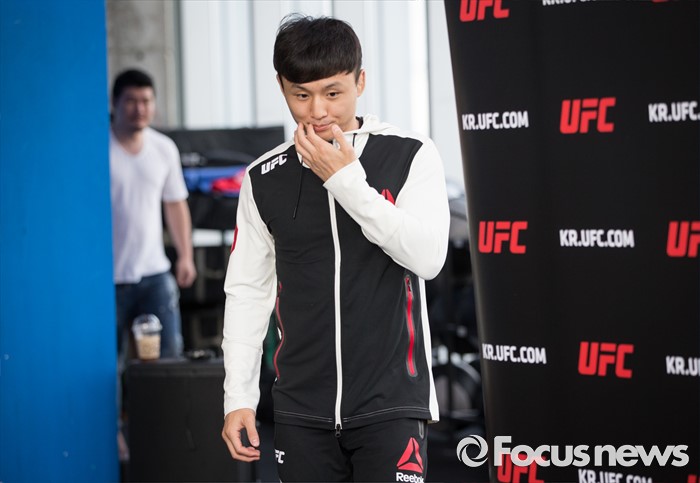 (서울=포커스뉴스) 지난 9일 티아고 타바레스(31, 브라질)를 1라운드 2분 42초에 TKO로 제압하고, UFC 3연속 KO 승리라는 쾌거를 이루고 귀국한 ‘코리안 슈퍼보이’ 최두호가 선수가 12일 오전 서울 여의도 리복 센티널 IFC에서 기자회견을 갖기 위해 입장하고 있다.