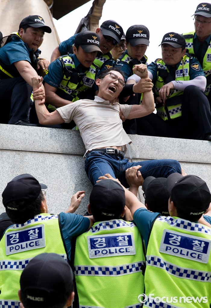 (서울=포커스뉴스) 12일 오전 서울 종로구 광화문광장 세종대왕 동상에서 최저임금 1만원 인상을 요구하며 시위를 하던 알바연대알바노조가경찰에게 연행되고 있다.