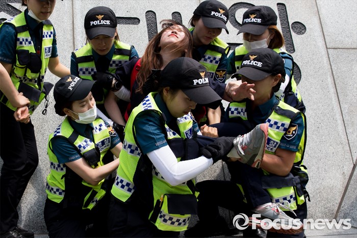 (서울=포커스뉴스) 12일 오전 서울 종로구 광화문광장 세종대왕 동상에서 최저임금 1만원 인상을 요구하며 시위를 하던 알바연대알바노조가경찰에게 연행되고 있다.