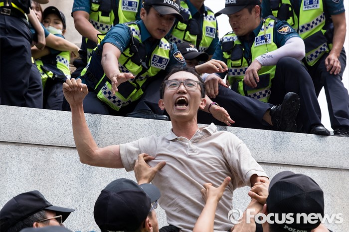 (서울=포커스뉴스) 12일 오전 서울 종로구 광화문광장 세종대왕 동상에서 최저임금 1만원 인상을 요구하며 시위를 하던 알바연대알바노조가경찰에게 연행되고 있다.