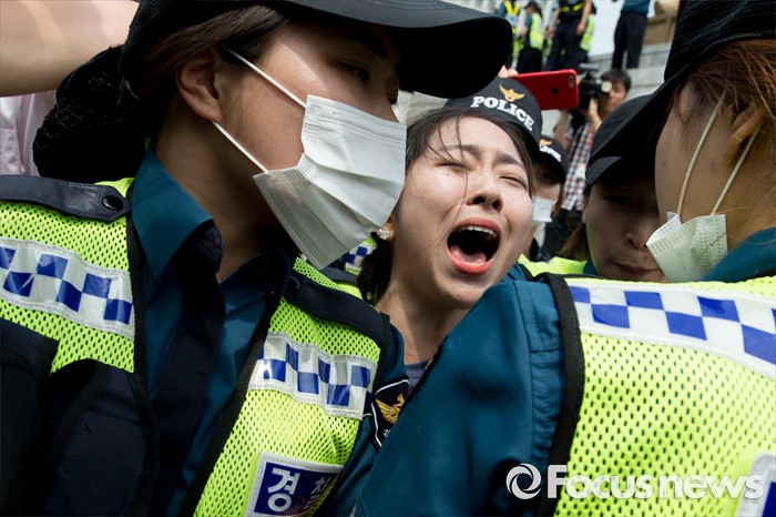 (서울=포커스뉴스) 12일 오전 서울 종로구 광화문광장 세종대왕 동상에서 최저임금 1만원 인상을 요구하며 시위를 하던 알바연대알바노조가경찰에게 연행되고 있다.