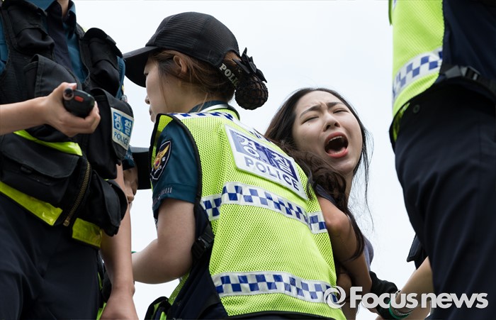 (서울=포커스뉴스) 12일 오전 서울 종로구 광화문광장 세종대왕 동상에서 알바연대알바노조가 최저임금 1만원 인상을 요구하며 기습시위를 벌이고 있다.