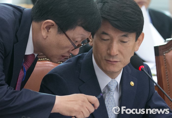 (서울=포커스뉴스) 12일 오전 서울 여의도 국회에서 열린 법제사법위원회 전체회의에 참석한 김용헌(오른쪽) 헌법재판소 사무처장이 관계자와 논의하고 있다.