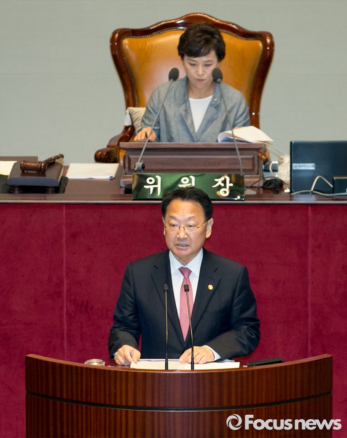 (서울=포커스뉴스) 12일 오전 서울 여의도 국회에서 2015회계연도 결산을 위해 열린 예산결산특별위원회 전체회의에 참석한 유일호 경제부총리 겸 기획재정부 장관이 제안설명을 하고 있다.