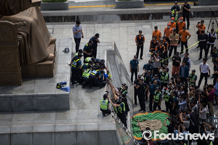 (서울=포커스뉴스) 12일 오전 서울 종로구 광화문광장 세종대왕 동상에서 알바연대알바노조가 최저임금 1만원 인상을 요구하며 기습시위를 벌이던 중 경찰들에게 제지당하고 있다.