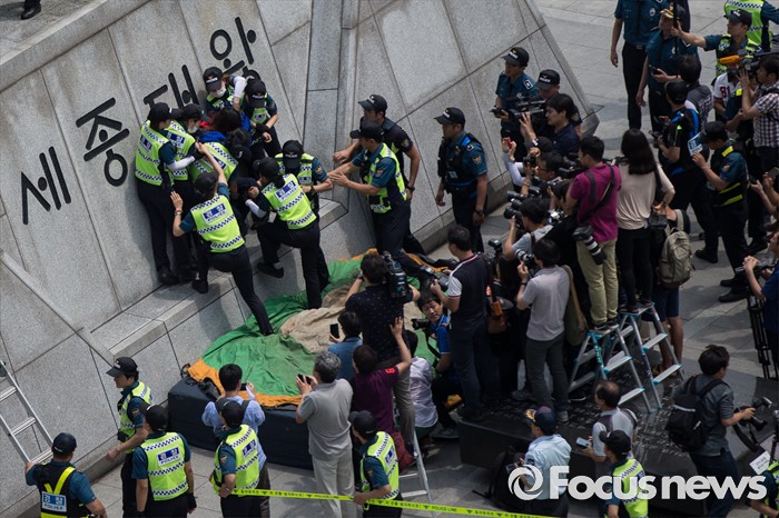 (서울=포커스뉴스) 12일 오전 서울 종로구 광화문광장 세종대왕 동상에서 알바연대알바노조가 최저임금 1만원 인상을 요구하며 기습시위를 벌이던 중 경찰들에게 제지당하고 있다.