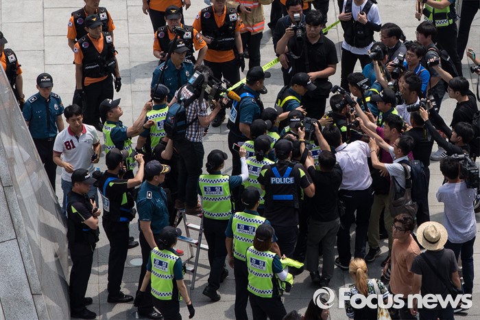 (서울=포커스뉴스) 12일 오전 서울 종로구 광화문광장 세종대왕 동상에서 알바연대알바노조가 최저임금 1만원 인상을 요구하며 기습시위를 벌이던 중 경찰들에게 제지당하고 있다.