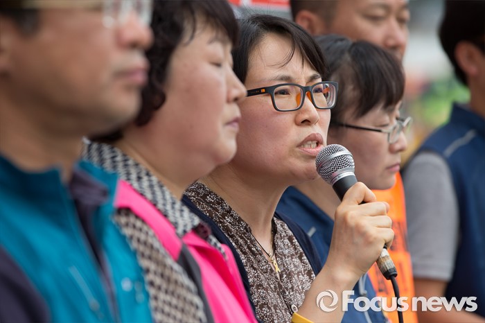 (서울=포커스뉴스) 12일 오전 서울 종로구 정부서울청사 앞에서 교육운동연대원들이 교육부 망언 고위관료 파면을 촉구하며 기자회견을 갖고 있다.