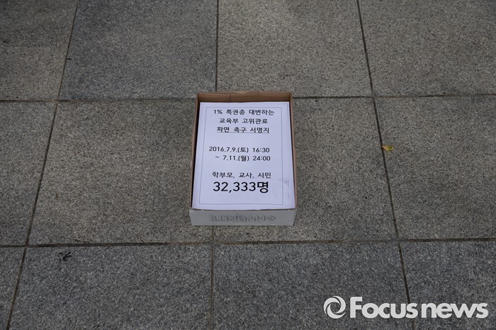 (서울=포커스뉴스) 12일 오전 서울 종로구 정부서울청사 앞에서 교육운동연대원들이 교육부 망언 고위관료 파면을 촉구하며 기자회견을 갖고 있다.