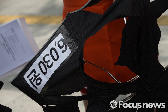 (서울=포커스뉴스) 경제정의실천시민연합 회원들이 12일 오후 서울 종로구 정부서울청사 앞에서 최저임금 인상 촉구 합동 기자회견을 하고 있다.