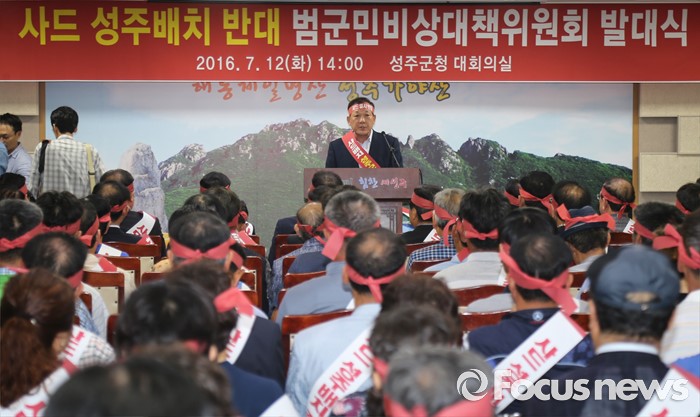 (서울=포커스뉴스) 김항곤 군수가 12일 오후 경북 성주군 성주읍 성주군청에서 열린 '사드 성주 배치 반대 범군민비상대책위원회' 발대식에서 발언하고 있다.(사진제공=성주군)