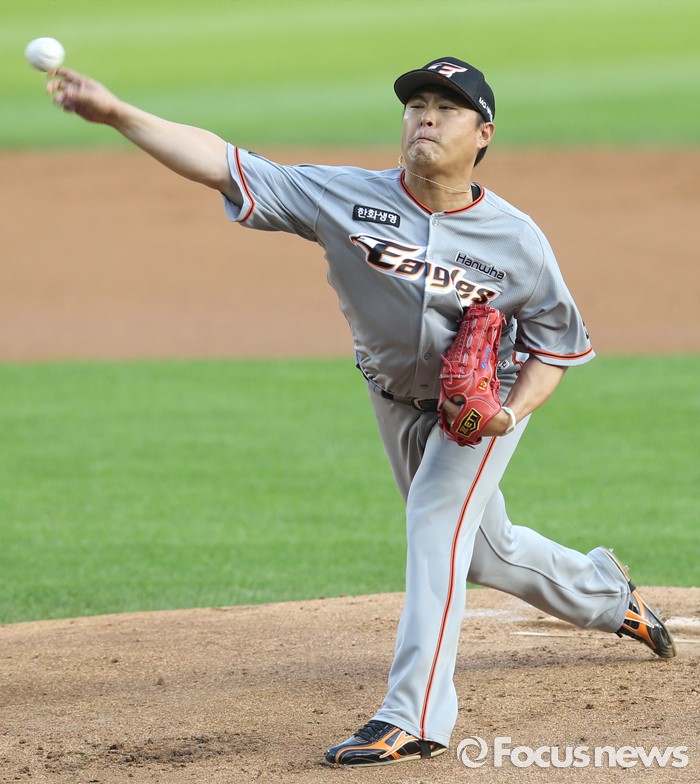 (서울=포커스뉴스) 12일 서울 잠실구장에서 열린 2016 프로야구 한화-LG 경기에서 1회말 한화 선발투수 송신영이 투구하고 있다.