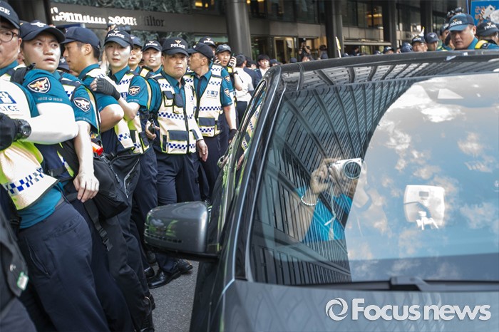 (서울=포컷뉴스) 12일 오후 서울 중구 밀레니엄서울힐튼호텔 앞에서 '일본 자위대 62주년 창설 기념식'을 규탄하는 시민단체들의 시위가 격렬히 열리고 있는 가운데 외교차량에 동승한 신원미상의 한 여성이 자신의 카메라로 시위대와 취재진의 모습을 촬영하고 있다.