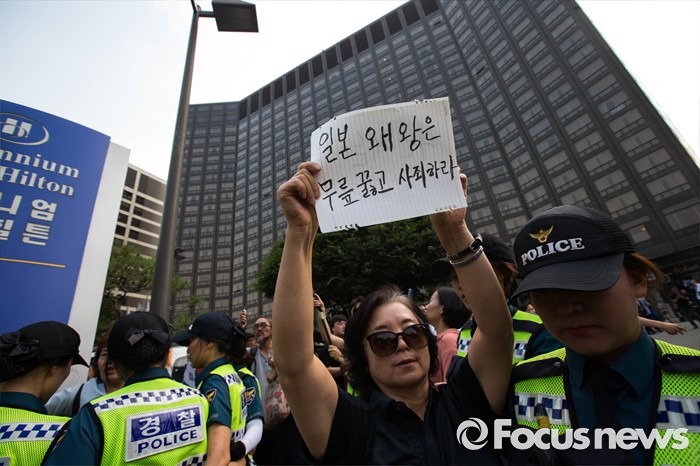 (서울=포컷뉴스) 12일 오후 서울 중구 밀레니엄서울힐튼호텔 앞에서 '일본 자위대 62주년 창설 기념식'을 규탄하는 시민단체들의 시위가 열리고 있다.