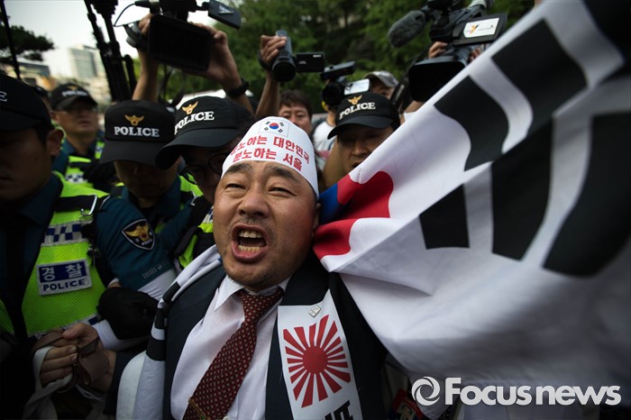 (서울=포컷뉴스) 12일 오후 서울 중구 밀레니엄서울힐튼호텔 앞에서 '일본 자위대 62주년 창설 기념식'을 규탄하는 시민단체들의 시위가 열리고 있다.