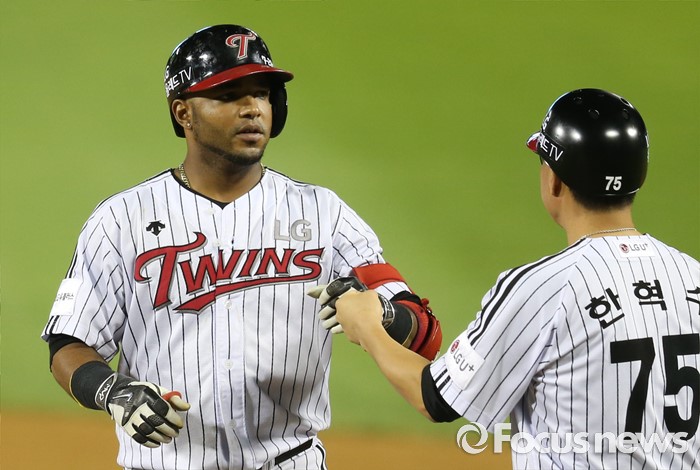 (서울=포커스뉴스) 12일 서울 잠실구장에서 열린 2016 프로야구 한화-LG 경기 6회말 무사 1루에서 LG 히메네스가 좌전 안타를 치고 한혁수 코치와 주먹을 마주치고 있다.