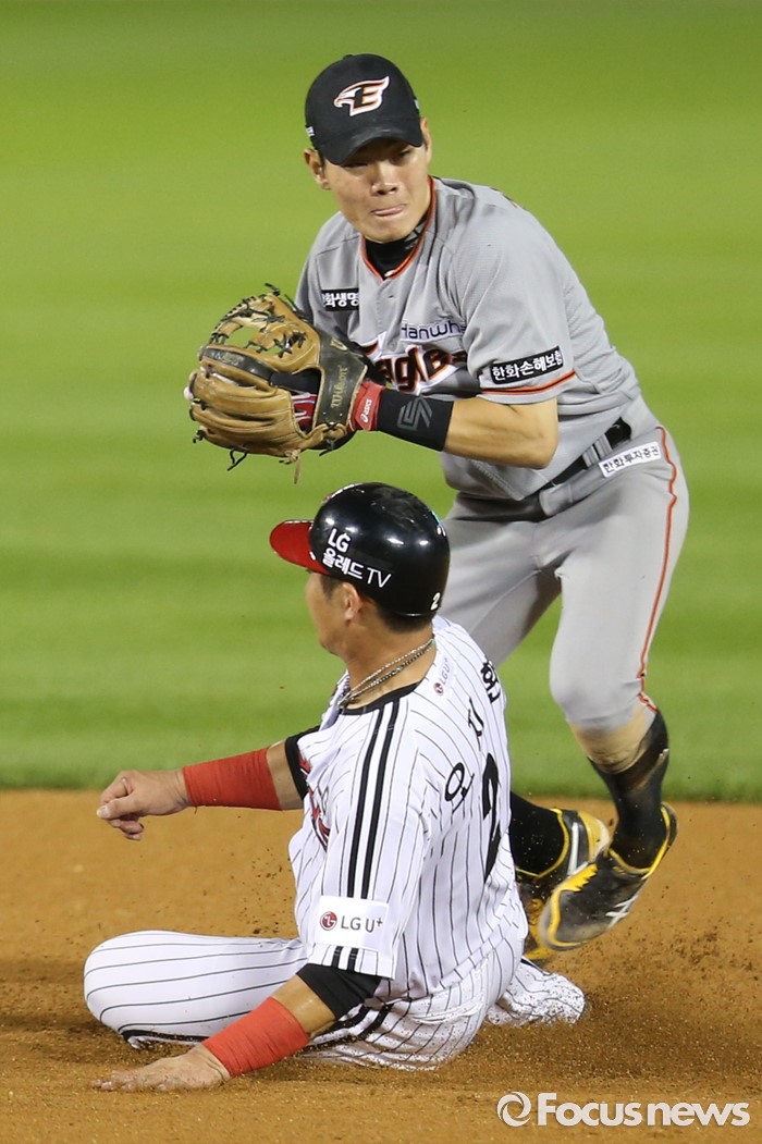 (서울=포커스뉴스) 12일 서울 잠실구장에서 열린 2016 프로야구 한화-LG 경기 6회말 1사 만루에서 LG 이병규의 2루수앞 땅볼때 1루주자 오지환이 2루에서 포스아웃되고 있다.